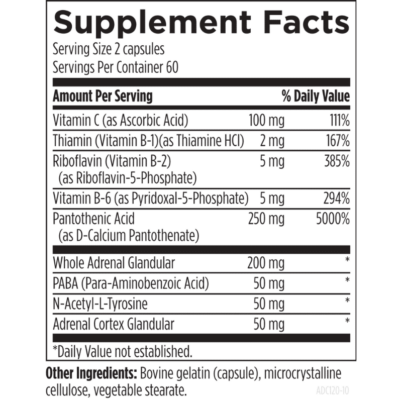 Adrenal Complex by Designs for Health is formulated to support optimal adrenal function and promote a healthy stress response. It combines 200 mg of whole adrenal glandular and 50 mg of adrenal cortex glandular per serving, sourced from certified BSE-free bovine. Enhanced with N-acetyl-L-tyrosine, vitamin C, and a comprehensive spectrum of B vitamins—including thiamin (B1), riboflavin (B2), pantothenic acid (B5), and pyridoxal-5-phosphate (P5P)—this supplement aids in hormone balance, energy production, and neurotransmitter synthesis. Ideal for individuals seeking to support their adrenal health and manage stress effectively.