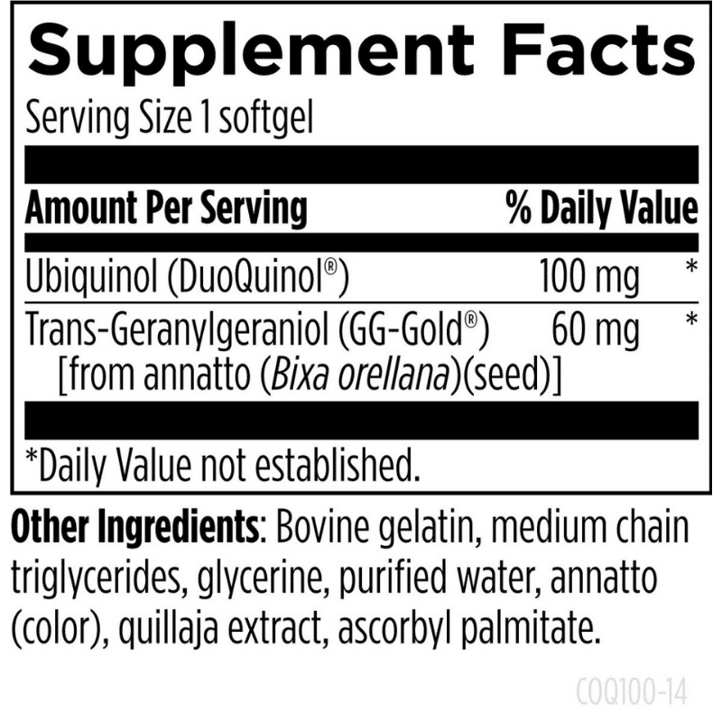 Serving Size: 1 softgel Amount Per Serving *Daily Value not established. Bovine gelatin, medium chain triglycerides, glycerine, purified water, annatto (color), quillaja extract, ascorbyl palmitate.Supplement Facts