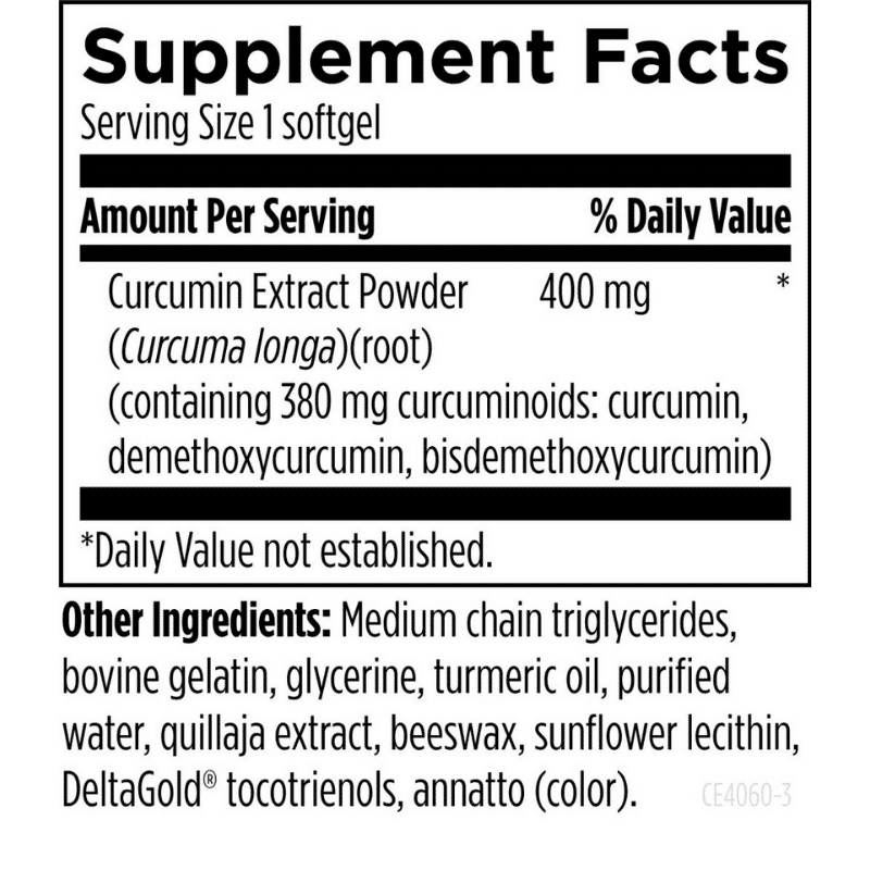 Serving Size: 1 softgel Amount Per Serving *Daily Value not established. Medium chain triglycerides, bovine gelatin, glycerine, turmeric oil, purified water, quillaja extract, beeswax, sunflower lecithin, DeltaGold® tocotrienols, annatto (color).Supplement Facts