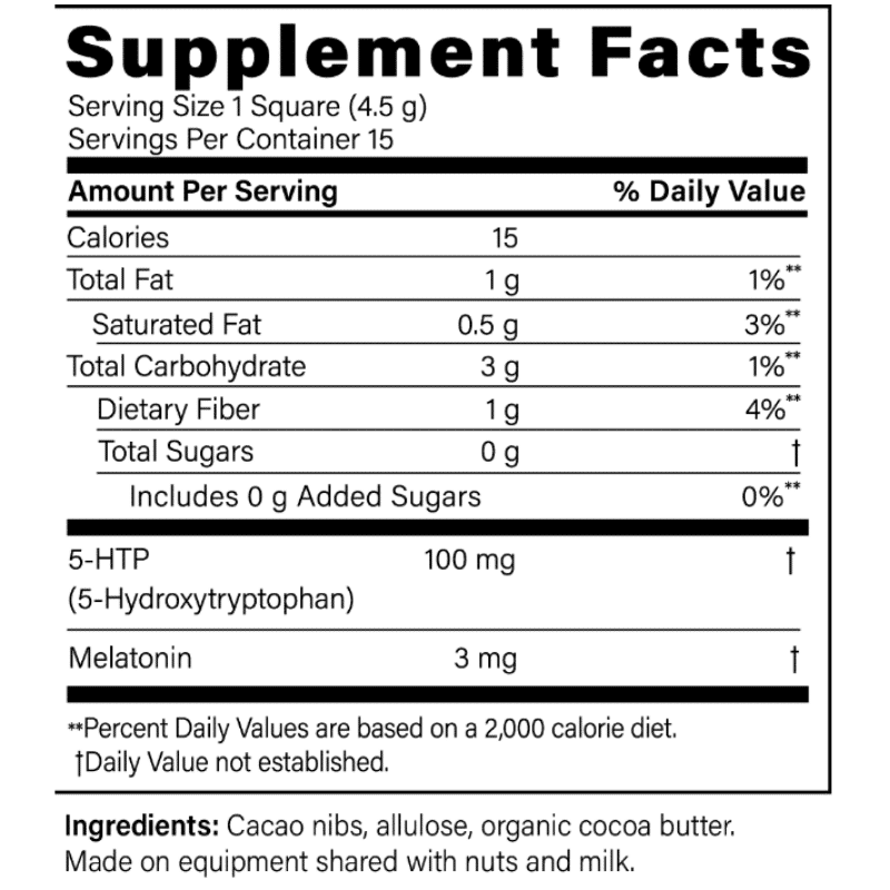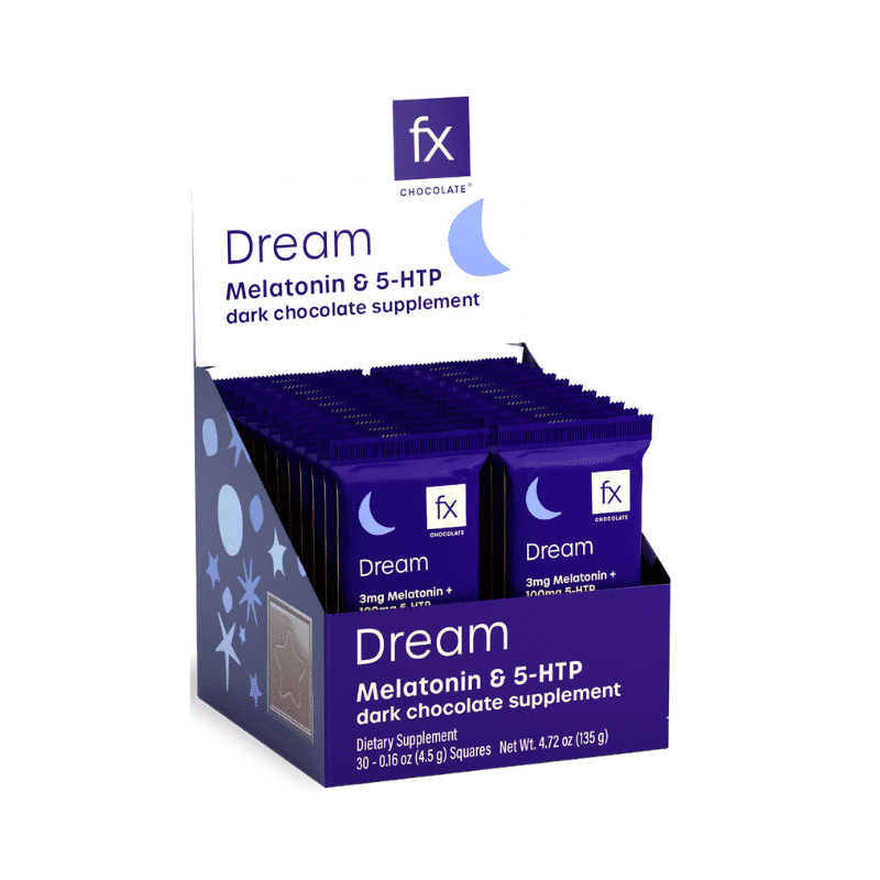 Fx Chocolate® Dream combines rich dark chocolate with melatonin and 5-hydroxytryptophan (5-HTP) to promote the brain’s ability to relax and rest. Melatonin helps regulate sleep by controlling the body’s circadian rhythms, while 5-HTP supports healthy neurotransmitter function, aiding in maintaining a balanced mood and overall relaxation. This sugar-free chocolate is sweetened with allulose, a naturally occurring sweetener found in fruits like jackfruit and figs, making it suitable for ketogenic and low-carb diets. Free from artificial sweeteners, flavors, colors, dairy, soy, and gluten, Fx Chocolate® Dream offers a delicious and convenient way to support restful sleep and relaxation.