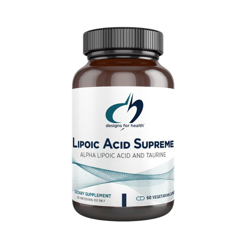 Lipoic Acid Supreme™ by Designs for Health provides alpha-lipoic acid and taurine per capsule to support metabolic health, healthy glucose metabolism, and antioxidant status. Alpha-lipoic acid is a sulfur-containing compound that helps the body respond to oxidative stress and supports the regeneration of other antioxidants, including glutathione, vitamins C and E, and coenzyme Q10. Taurine is a sulfur-containing amino acid that plays an important role in energy metabolism and metabolic health, helping to maintain healthy blood glucose and lipid metabolism, and supporting insulin and mitochondrial function. Together, these ingredients support antioxidant status and help promote healthy blood glucose metabolism. Lipoic Acid Supreme™ is gluten-free, dairy-free, soy-free, and non-GMO.