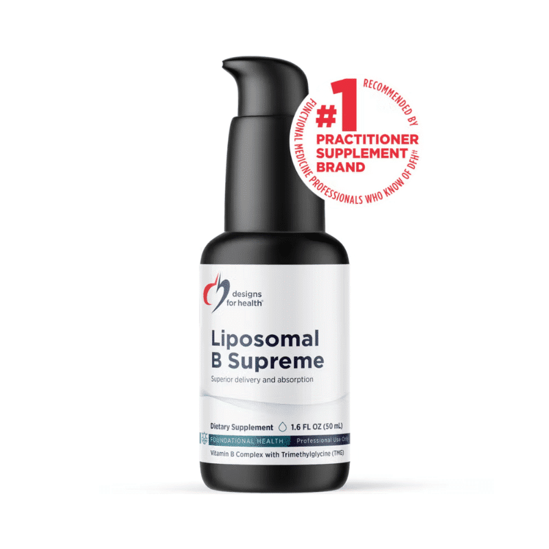 Liposomal B Supreme by Designs for Health delivers a comprehensive blend of B vitamins in a highly absorbable liposomal form to support energy production, mental health, and stress response.