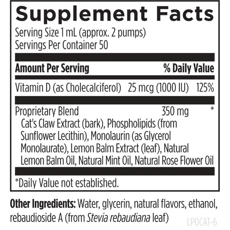 Liposomal Cat’s Claw Synergy by Designs for Health combines cat’s claw, monolaurin, vitamin D, and lemon balm to support immune function and a healthy inflammatory response. Cat’s claw is a vine native to the Amazon rainforest, known for its immune-supporting properties. Monolaurin, derived from lauric acid, promotes a healthy microbiome. Vitamin D supports immune system development and function, while lemon balm aids relaxation and a healthy immune response. Utilizing advanced liposomal technology, this formula ensures enhanced absorption and bioavailability, delivering nutrients directly to cells. Liposomal Cat’s Claw Synergy is gluten-free, dairy-free, soy-free, and non-GMO.