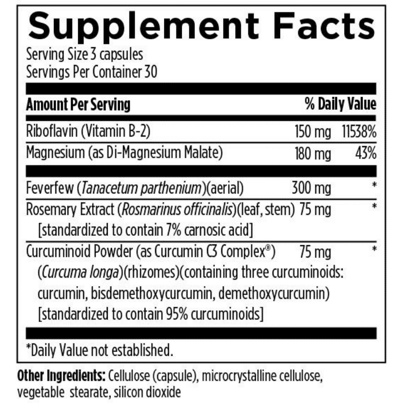 Migranol™ by Designs for Health combines clinically relevant amounts of feverfew, rosemary extract, and a blend of three powerful curcuminoids (curcumin, bisdemethoxycurcumin, and demethoxycurcumin) to support brain health and a healthy inflammatory response. Feverfew (Tanacetum parthenium) has been shown to support brain health and a healthy inflammatory response, while curcuminoids derived from turmeric (Curcuma longa) may help promote a healthy inflammatory response in the body and brain. Riboflavin may help support normal physiological responses and the body’s normal response to discomfort, and magnesium plays a fundamental role in muscle health, supporting the function and relaxation of muscles. Rosemary extract may help support brain health and a healthy inflammatory response. This formula is gluten-free, dairy-free, soy-free, and non-GMO.