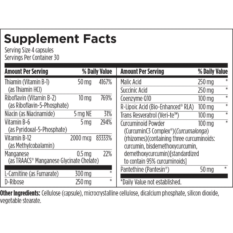 Mitochondrial NRG™ by Designs for Health is a comprehensive formula crafted to support the mitochondria—the “powerhouses” of the cell responsible for producing over 90% of cellular energy (ATP). This blend includes Coenzyme Q10, R-lipoic acid, L-carnitine, D-Ribose, malic and succinic acids, bioactive B vitamins, and botanicals like resveratrol and curcumin. These components work synergistically to enhance energy production, support antioxidant status, and promote healthy mitochondrial function. This formulation is vegetarian, dairy-free, gluten-free, soy-free, and non-GMO.
