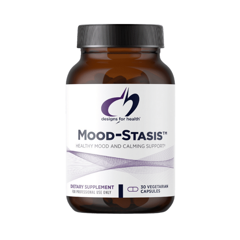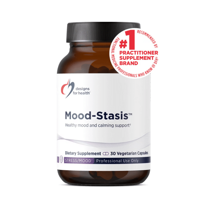 Mood-Stasis™ by Designs for Health is a synergistic blend of vitamins and botanicals designed to support a calm and positive mental outlook, promoting a normal stress response.