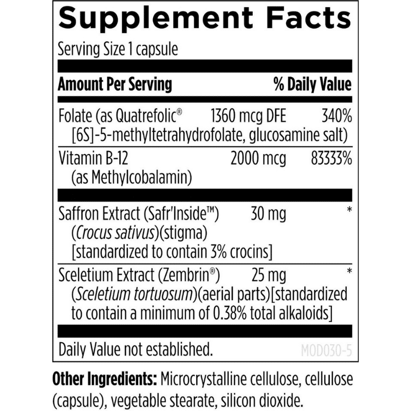 Mood-Stasis™ by Designs for Health combines saffron and sceletium extracts with methylated forms of vitamin B12 and folate to support a calm and positive mental outlook and promote a normal stress response. Saffron has a long history of culinary and medicinal uses, with research indicating it may support a positive mental outlook, promote a healthy inflammatory response, and support neurotransmitter metabolism. Sceletium has been traditionally used for relaxation and stress reduction, with modern research supporting its potential to enhance positive mood and cognitive function. Folate and vitamin B12 play important roles in the synthesis and regulation of serotonin and dopamine. This formulation is gluten-free, dairy-free, soy-free, and non-GMO.