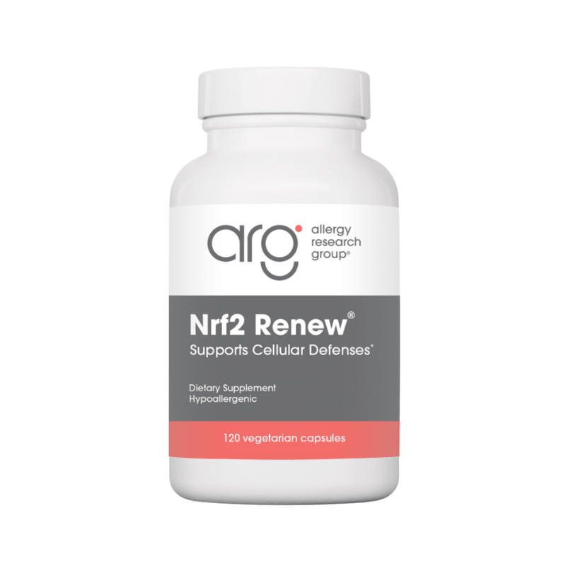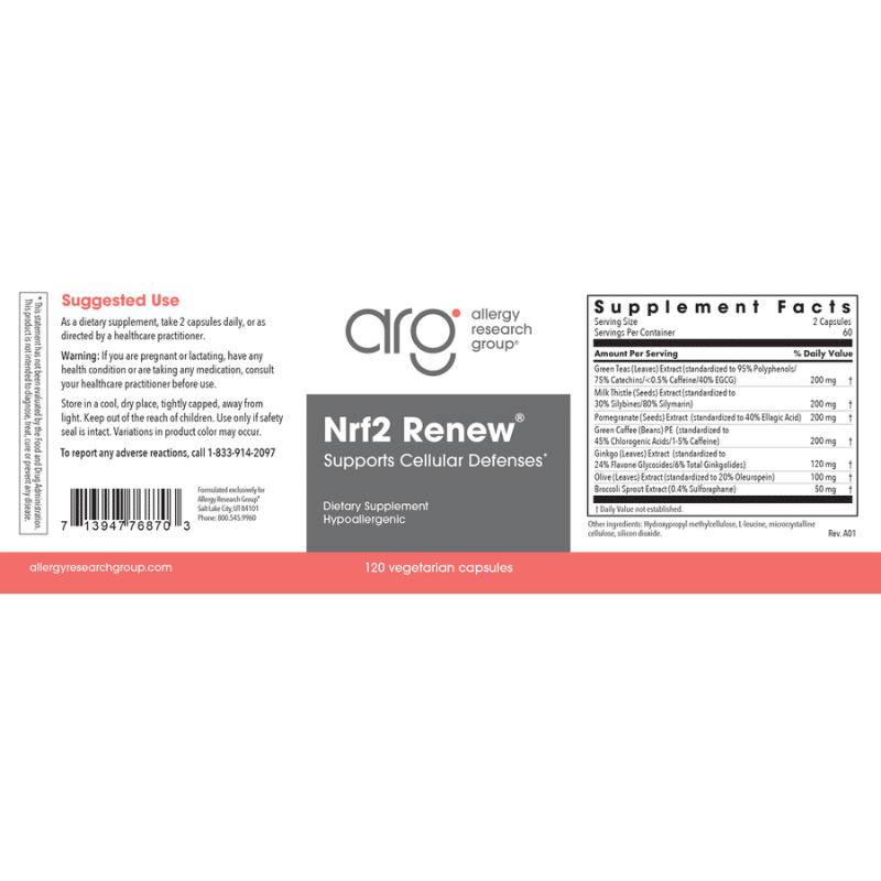 Nrf2 Renew Capsules by Allergy Research Group supports antioxidant defenses with sulforaphane, EGCG, and plant extracts for cellular health and detoxification.