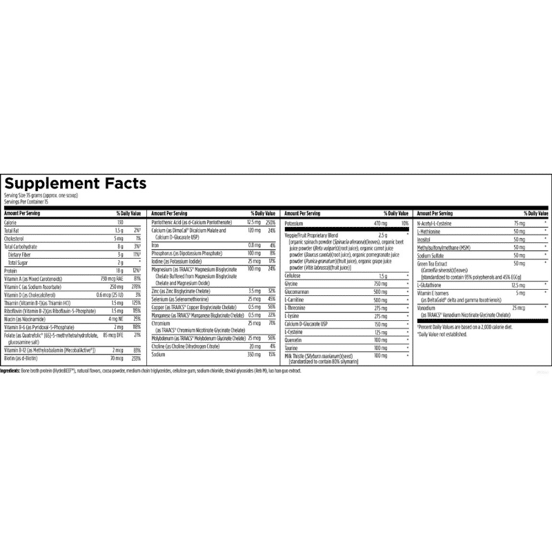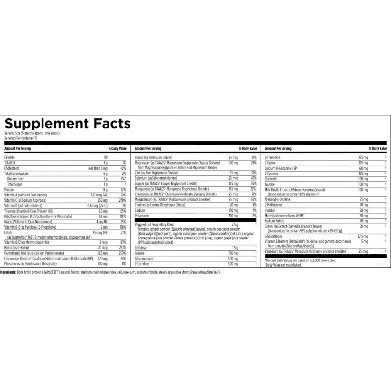 Serving Size: 36 grams (approx. one scoop) Servings Per Container: 15 Amount Per Serving * Percent Daily Values are based on a 2,000 calorie diet. † Daily Value not established. Bone broth protein (HydroBEEF®), natural flavors, cocoa powder, medium chain triglycerides, cellulose gum, sodium chloride, steviol glycosides (Reb M), luo han guo extract.Chocolate 525 g (1.2 lbs) Powder