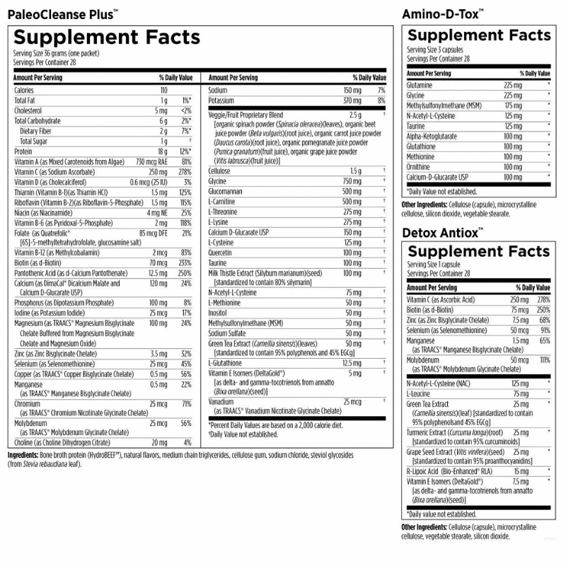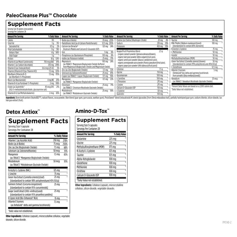 Serving Size: 36 grams (one packet) Servings Per Container: 28 * Percent Daily Values are based on a 2,000 calorie diet. † Daily Value not established. Bone broth protein (HydroBEEF®), natural flavors, cocoa powder, fiber blend, PhytoSweet® blend, sodium chloride, silicon dioxide, luo han guo extract.PaleoCleanse Plus™ Chocolate - Supplement Facts