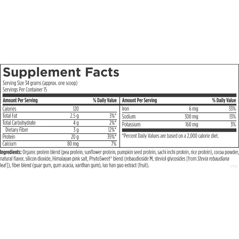 Serving Size: 34 grams (approx. one scoop) Servings Per Container: 15 Amount Per Serving * Percent Daily Values are based on a 2,000 calorie diet. Organic protein blend (pea protein, sunflower protein, pumpkin seed protein, sachi inchi protein, rice protein), cocoa powder, natural flavor, silicon dioxide, Himalayan pink salt, PhytoSweet® blend (rebaudioside M, steviol glycosides [from Stevia rebaudiana leaf]), fiber blend (guar gum, gum acacia, xanthan gum), luo han guo extract (fruit). Serving Size: 31 grams (approx. one scoop) Servings Per Container: 15 Amount Per Serving * Percent Daily Values are based on a 2,000 calorie diet. Organic protein blend (pea protein, sunflower protein, pumpkin seed protein, sachi inchi protein, rice protein), natural flavor, silicon dioxide, Himalayan pink salt, PhytoSweet® blend (rebaudioside M, steviol glycosides [from Stevia rebaudiana leaf]), fiber blend (guar gum, gum acacia, xanthan gum), luo han guo extract (fruit).Supplement Facts