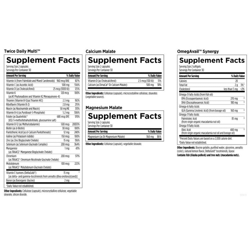Twice Daily Multi™: A blend of highly bioavailable vitamins and minerals that are difficult to obtain from food alone, supporting foundational health.