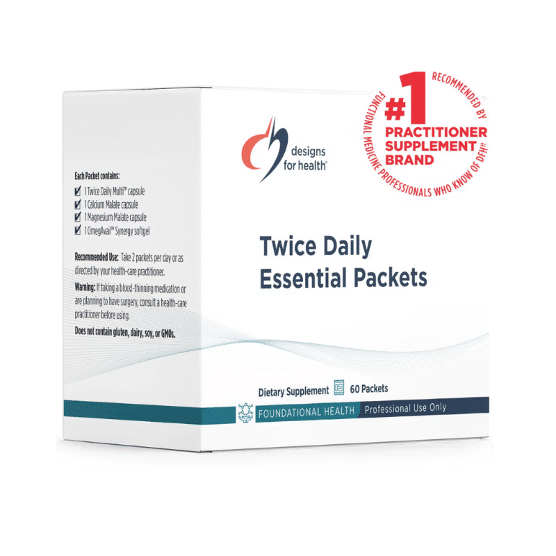 Twice Daily Essential Packets by Designs for Health offer a convenient, all-in-one solution to support overall wellness. Each packet contains a blend of essential vitamins, minerals, and omega-3 fatty acids, designed to promote optimal health, energy levels, and immune function.
