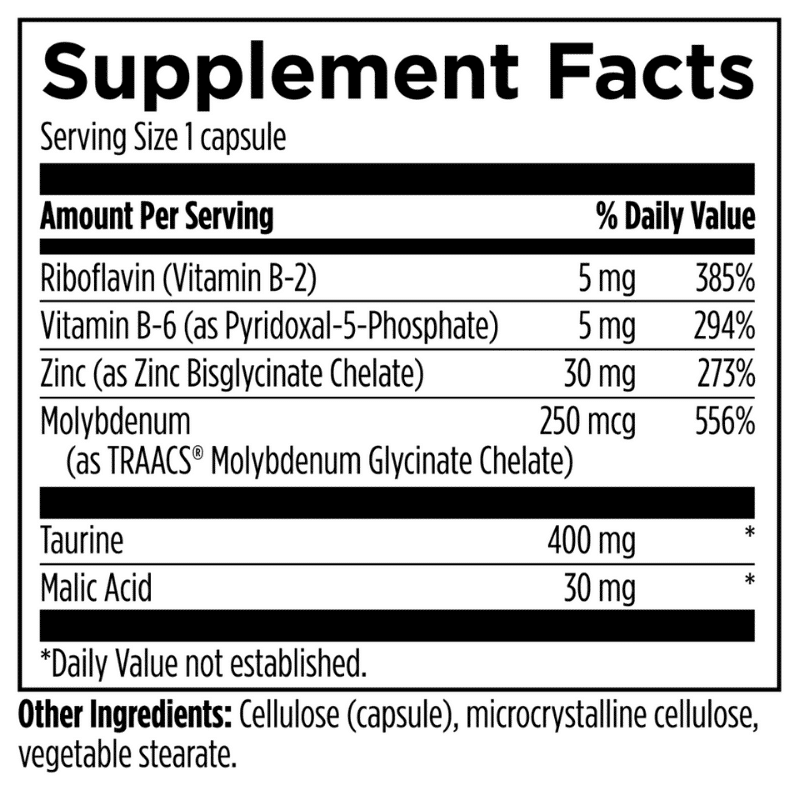 • Molybdenum (as TRAACS® Molybdenum Glycinate Chelate): 250 mcg (556% Daily Value)