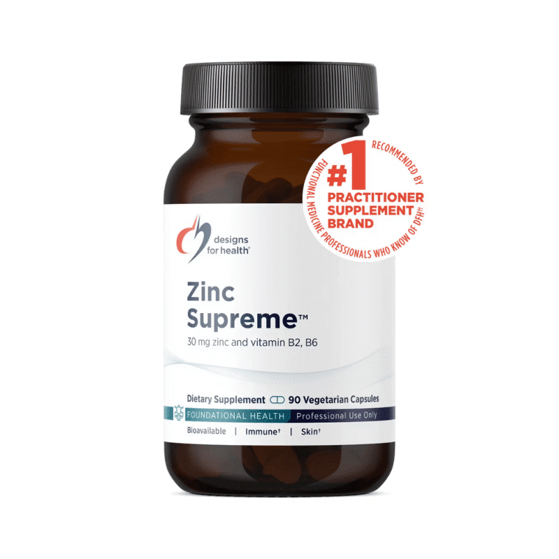 Zinc Supreme™ by Designs for Health is a premium supplement that combines highly bioavailable zinc bisglycinate chelate with essential cofactors, including vitamin B6, vitamin B2, and molybdenum, to support immune function, reproductive health, and overall wellness. This formulation is designed for optimal absorption and efficacy, making it an excellent choice for individuals seeking to maintain adequate zinc levels and promote general health.